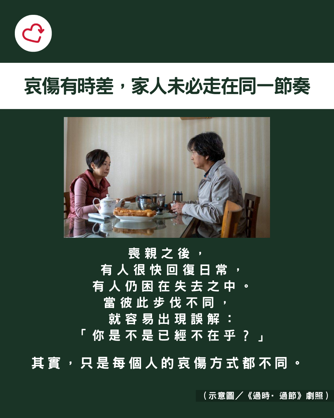 與此同時,家中其他成員的反應也大相徑庭:有人迅速回歸日常,有人卻仍無法接受喪親的事實。這種節奏上的「時差」,易使彼此產生對方「不再在乎」的錯覺。指責與誤解一旦形成,便成了多一份喪親以外的情緒負擔。