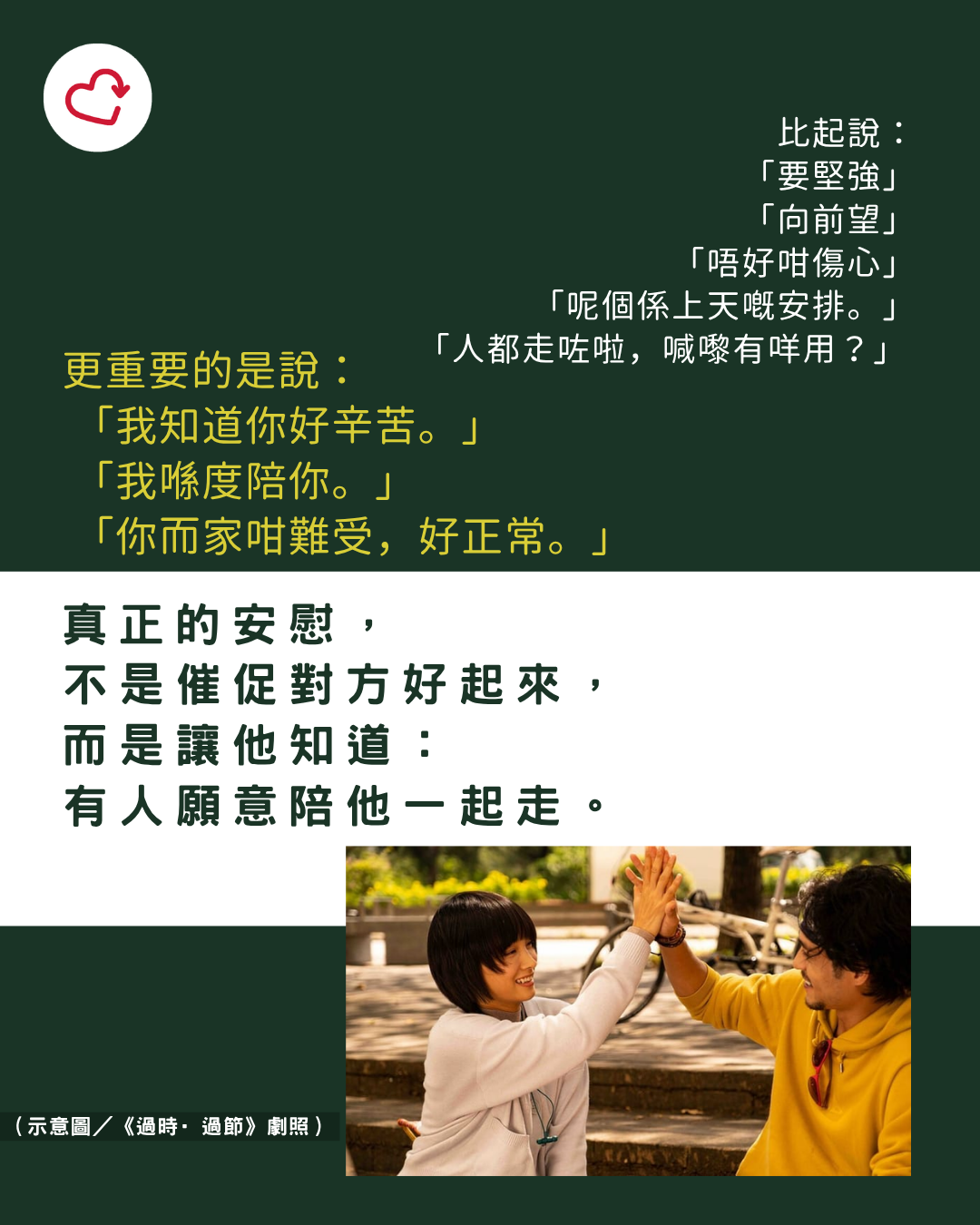 這類說話聽起來正面,但隱含「快啲好返」的期待,反而容易增加對方的壓力與內疚感。