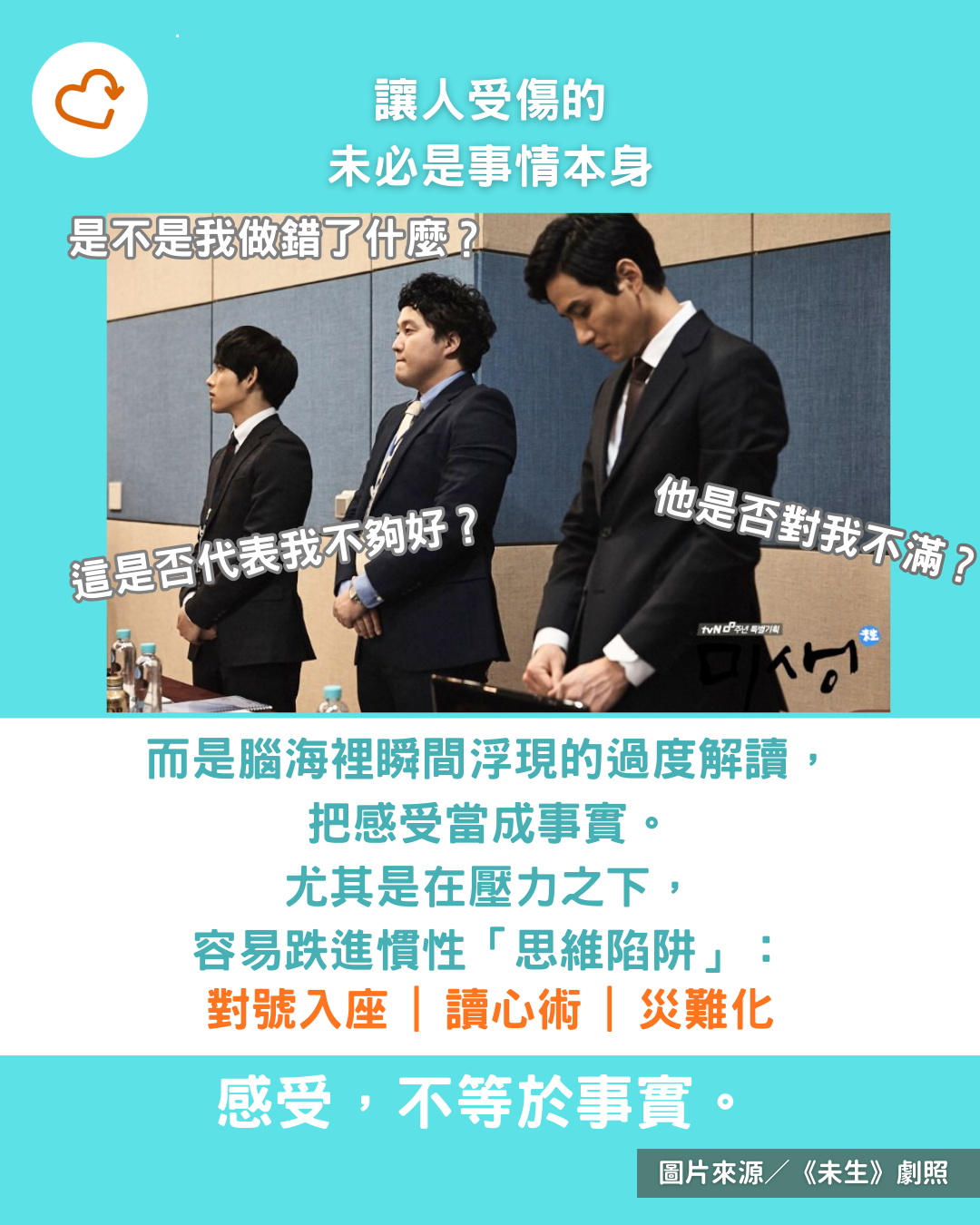 讀心術:在沒有足夠證據的情況下,先替對方下結論。例如,主管重新分配工作時,內心已經自動播放:「他一定覺得我能力不夠。」於是情緒先一步跌到谷底。