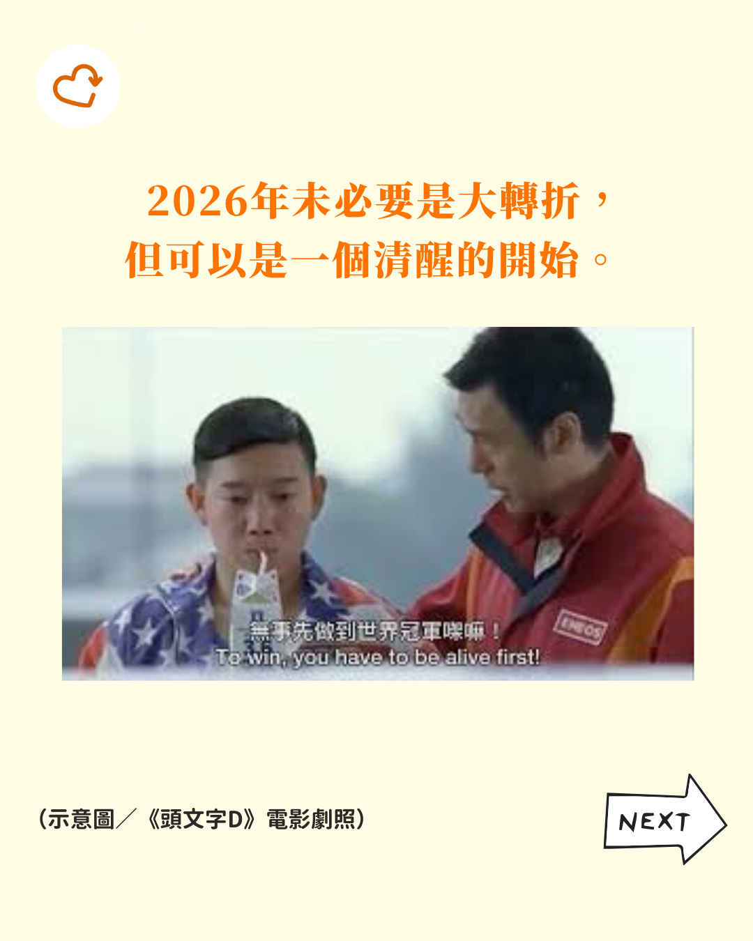 我們不只是要「撐過去」,應該擁有一種能夠長期走下去的生活方式。引用電影《頭文字D》金句:「人無事,先可以做到世界冠軍。」
