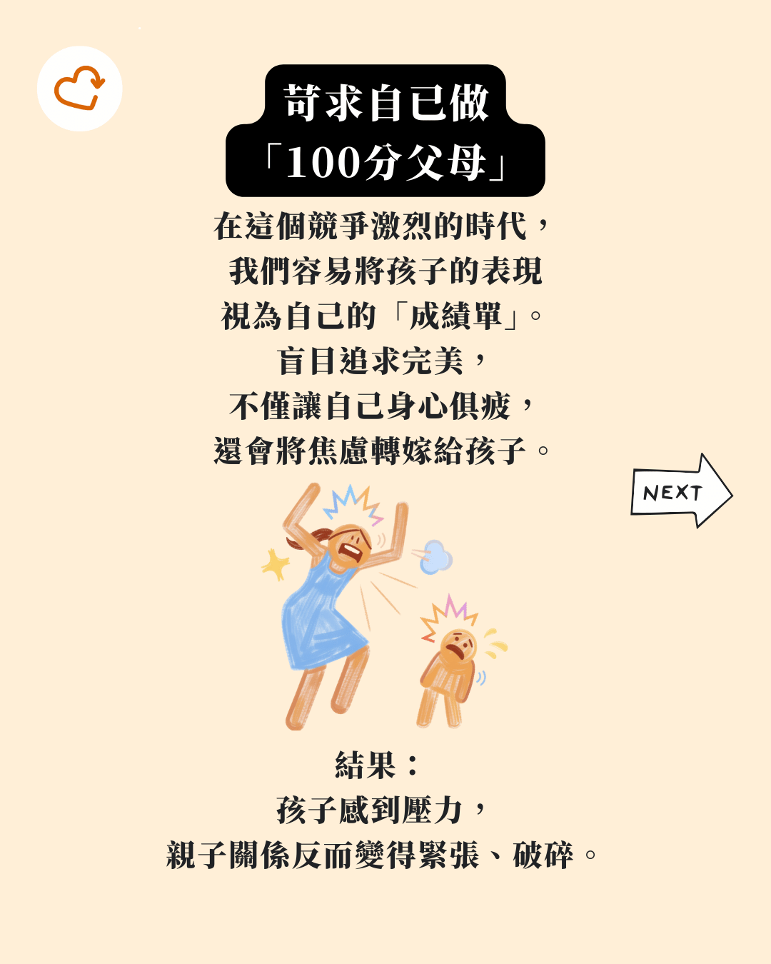 這些期望雖然源自對孩子的愛,但不知不覺間,父母對「完美」的追求變得愈發苛刻,並將種種壓力、焦慮與疲憊,轉嫁到了子女身上。我們容易將孩子的言行舉止、學業成就,視為自己的「成績單」,要求子女跟得上自己心中「完美」的步伐。稍有差池,父母若不是陷入深深的自責,就是對孩子宣洩情緒。