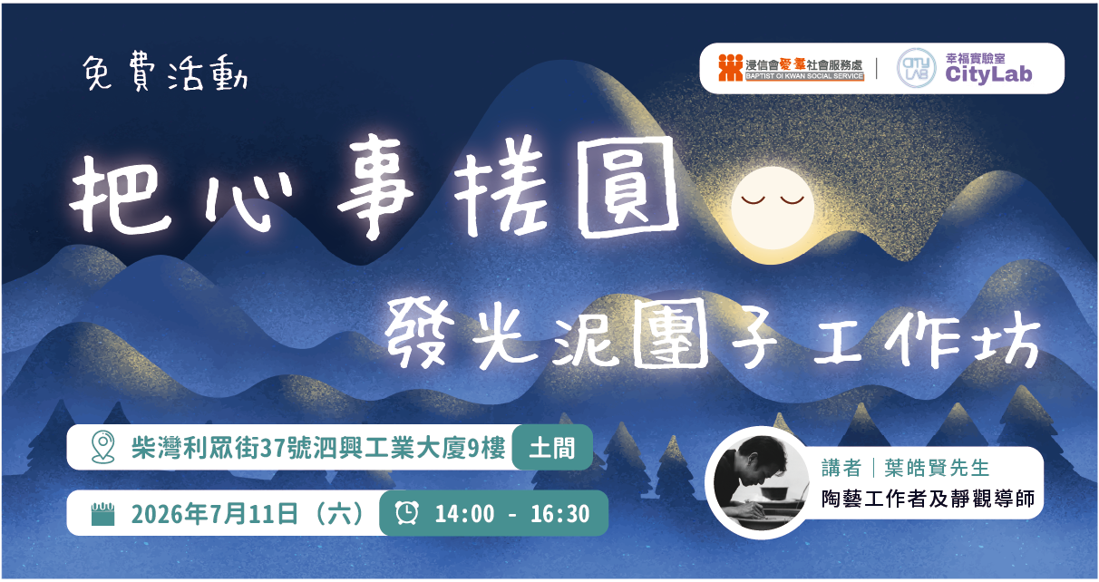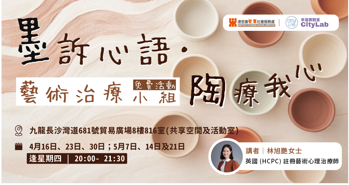 浸信會愛羣社會服務處與「幸福實驗室」(CityLab)攜手合辦「守護希望:藝術治療計劃」,透過一系列免費藝術工作坊及藝術治療小組,邀請公眾嘗試不同藝術媒介——造紙、陶泥、書法、攝影、烘焙等,在創作中探索自我、表達情感,在陪伴與分享中慢慢修復心靈。
