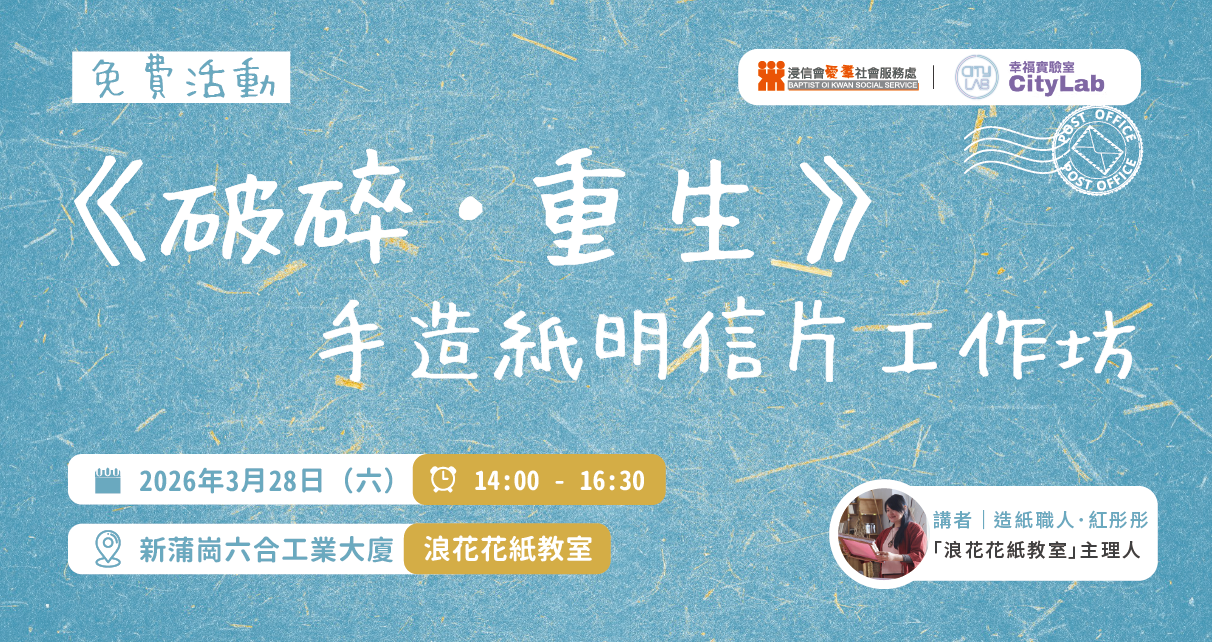 創傷,有時猶如被撕碎的紙張,散落一地,但也有重生的機會。本工作坊邀請你走進造紙的世界,在紙漿製作過程中,學習接納破碎;再於抄紙到裝飾之中,揉合自身的創意與情感;最後把碎片重新拼湊成一張又一張盛載溫度的明信片,將思緒好好寄託、好好傳遞。部分作品日後或會作公開展覽,讓這份安慰可以撫慰更多有需要的人。