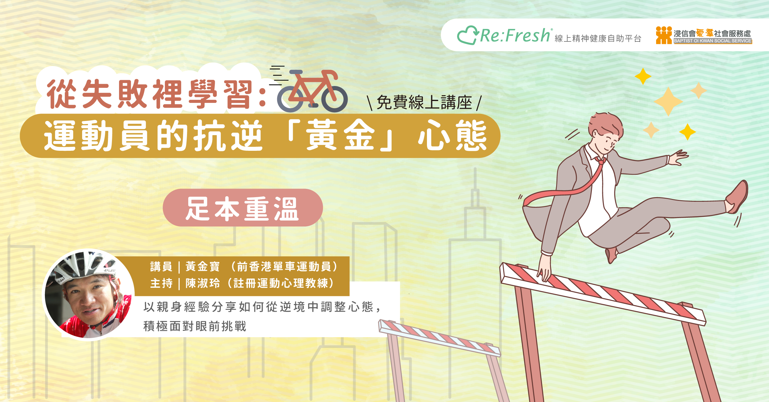 講者簡介|前香港馬拉松亞運代表、亞洲馬拉松錦標賽季軍、世界半馬拉松錦標賽香港代表、鐵人三項世界錦標賽資格與完賽者、英國註冊物理治療師、體育教學博士;擁有豐富國際賽事經驗及專業學術背景。